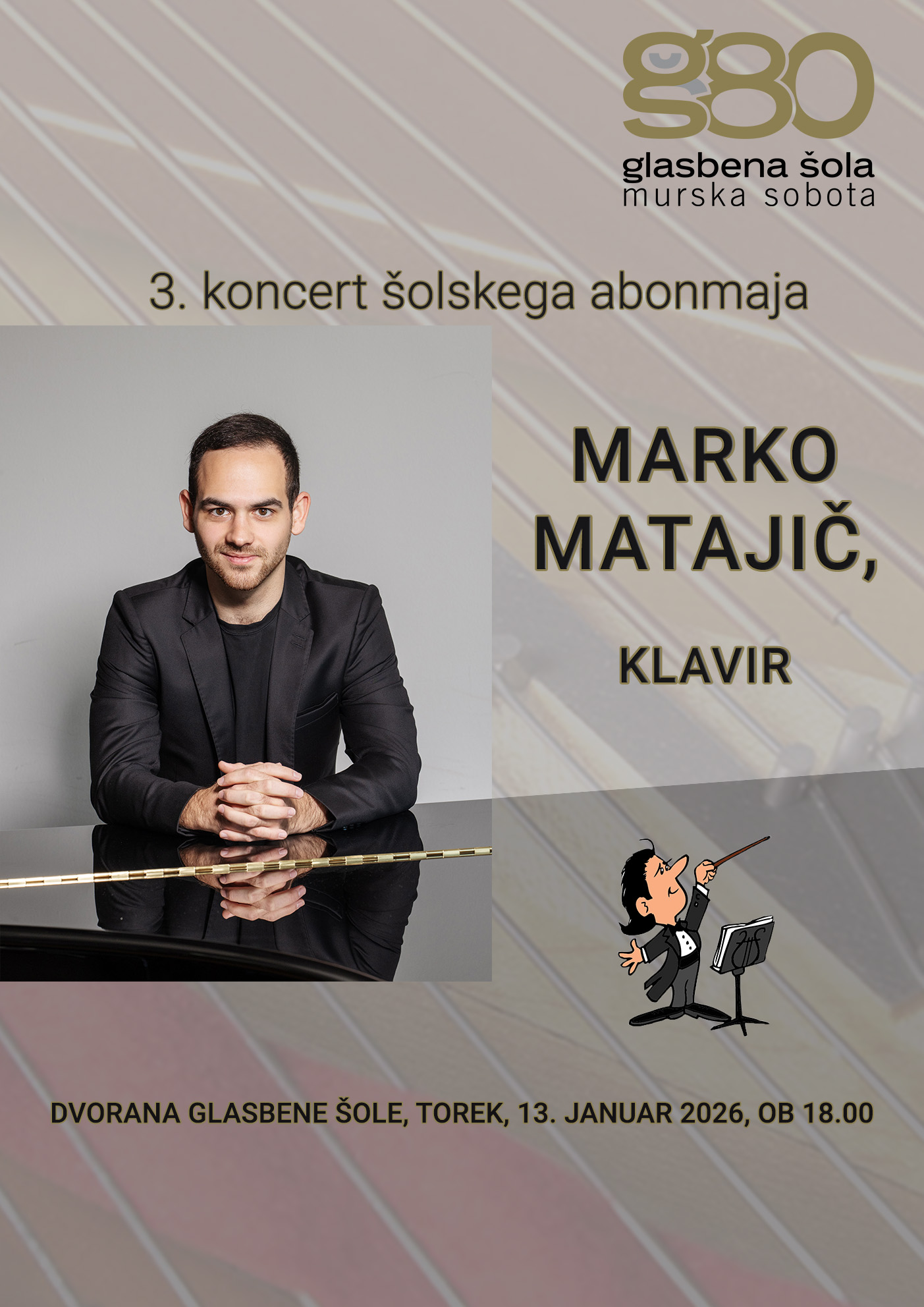 Vljudno vabljeni na 3. koncert šolskega abonmaja, na katerem bo nastopil naš nekdanji učenec klavirja Marko Matajič. Koncert bo v torek, 13. januarja 2026, ob 18.00 v dvorani šole.