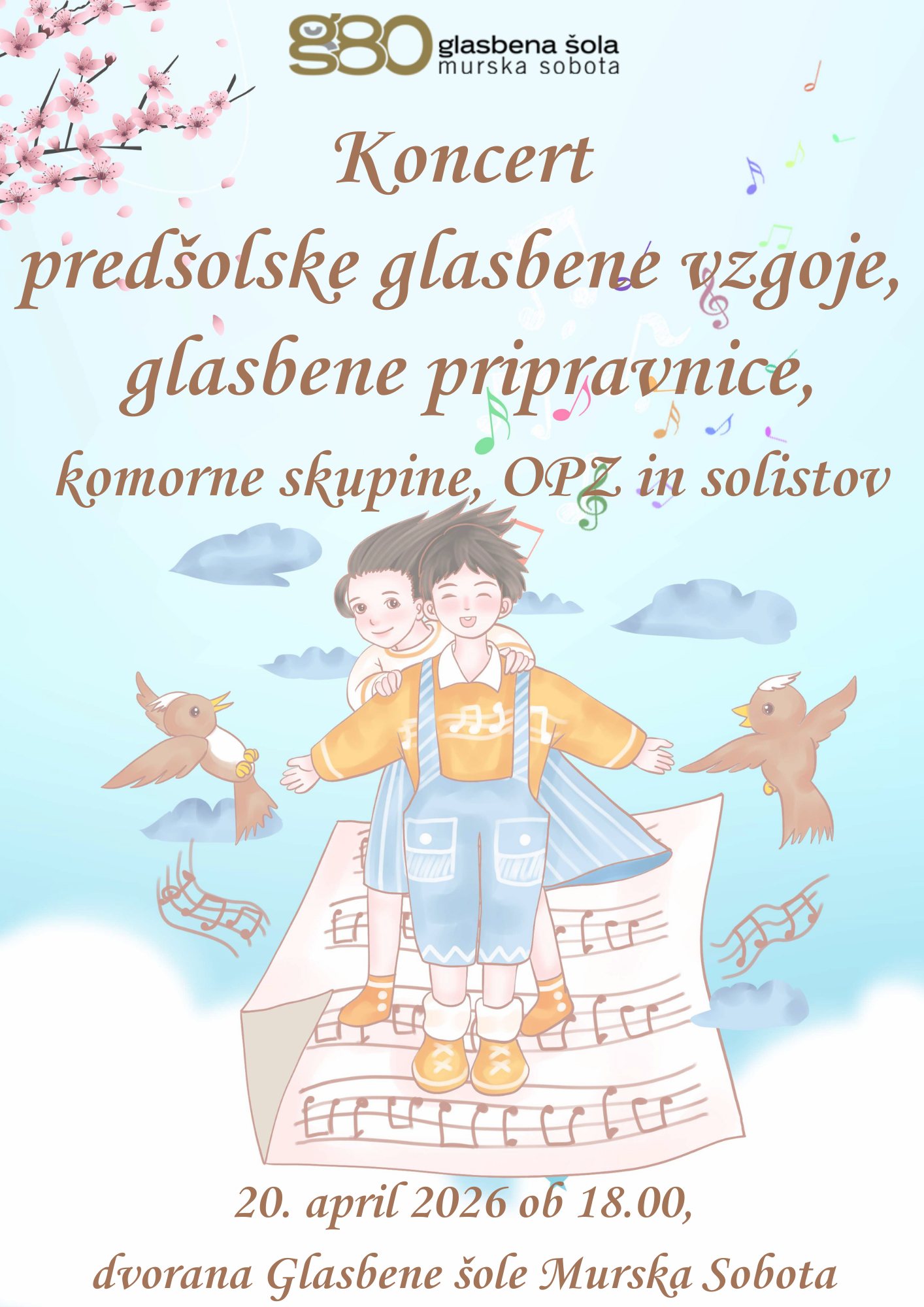 Vabimo vas na koncert naših najmlajših, ki bo v ponedeljek, 20. aprila 2026, ob 18.00 v dvorani šole. Na nastopu se jim bodo pridružili tudi člani otroškega pevskega zbora, komorne skupine in solisti.